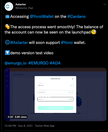 最近,Astarter成功推出了與Cardano官方輕型錢包Yoroi Wallet的整合演示。EMURGO開發的Yoroi錢包是一個快速、安全和簡單的輕型錢包,作為Cardano ADA和Ergo ERG持有人存儲和交易其加密貨幣的網絡。Yoroi錢包也經過全面的安全審核,力求成為Cardano和Ergo用戶的日常錢包。Yoroi錢包還宣布計劃在其錢包內推出其dApp連接器,作為Cardano ADA用戶與其他基於Cardano的dApp互動的橋梁,將Yoroi定位為Cardano生態系統的類似MetaMask的錢包。