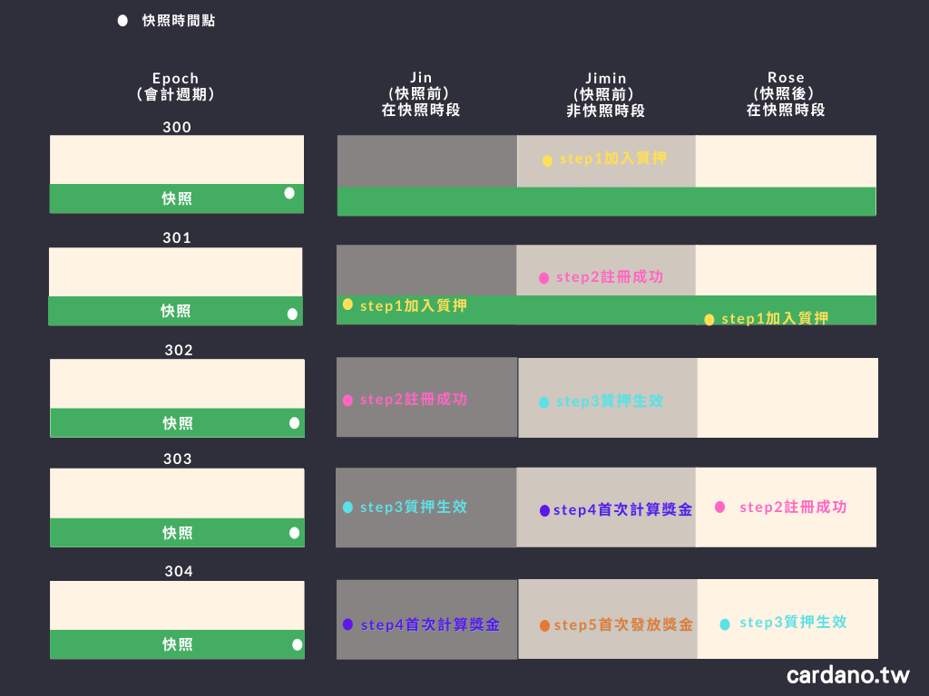 Rose也同樣在 301週期的快照時段加入質押,但他於快照後才進入,所以他錯過快照,等下一個週期,並於 303週期才順利註冊成功,接下並於 304週期質押生效、305週期首次計算 303的獎勵、306週期首次發放 303的獎勵。