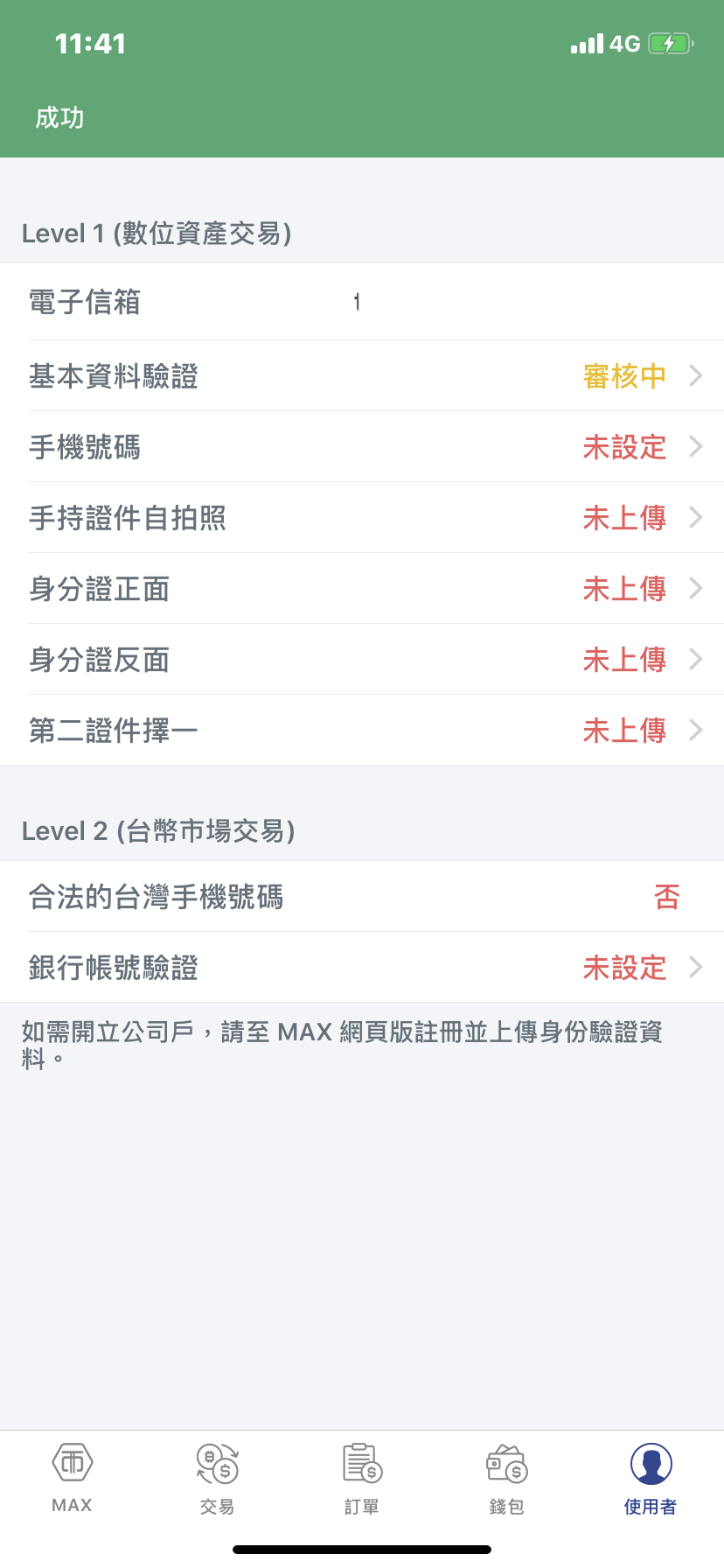 - 基本資料驗證:基本資料驗證欄位,會顯示「 審核中」,完成後,則可進行第2步驗證。