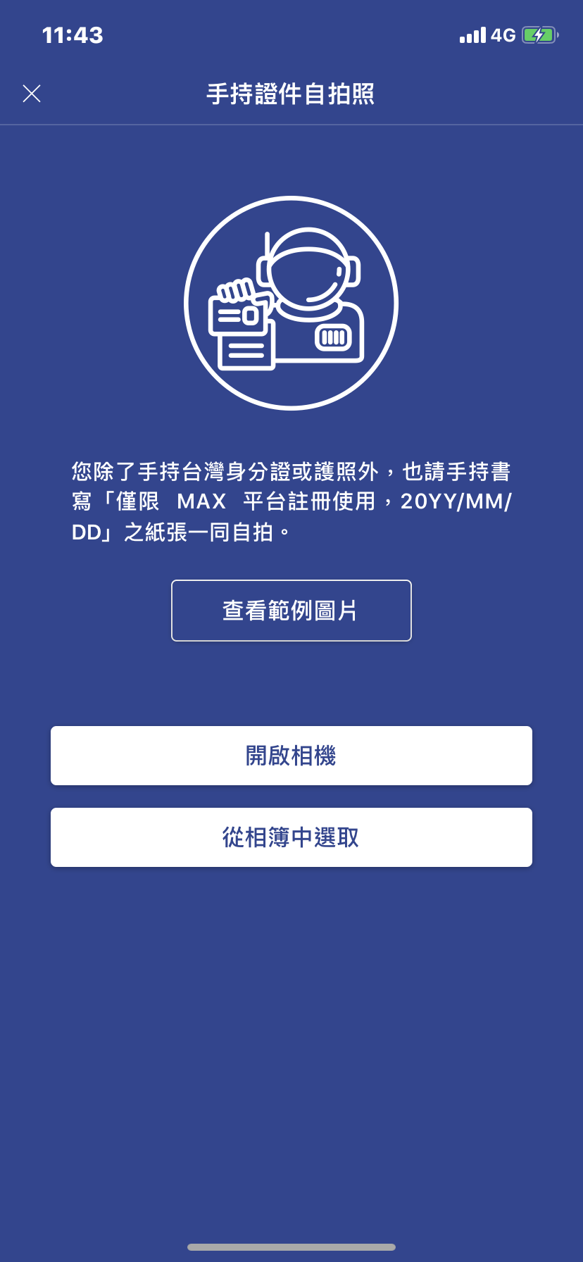 身分證、白紙(須手寫上僅限MAX平台註冊使用+當天上傳日期)照片。