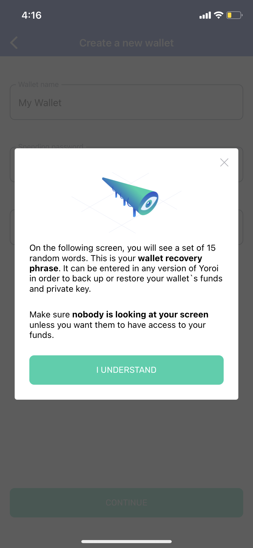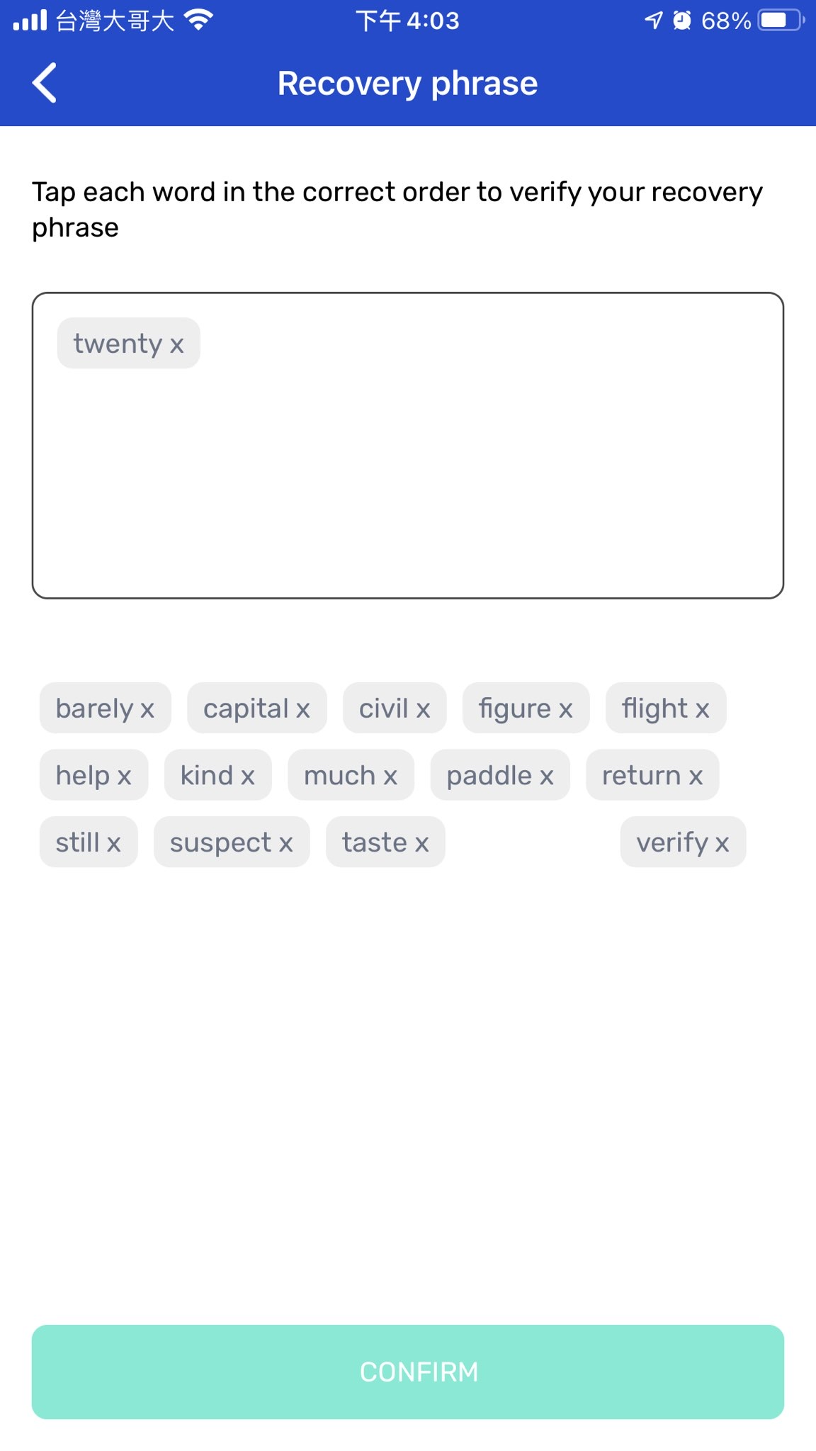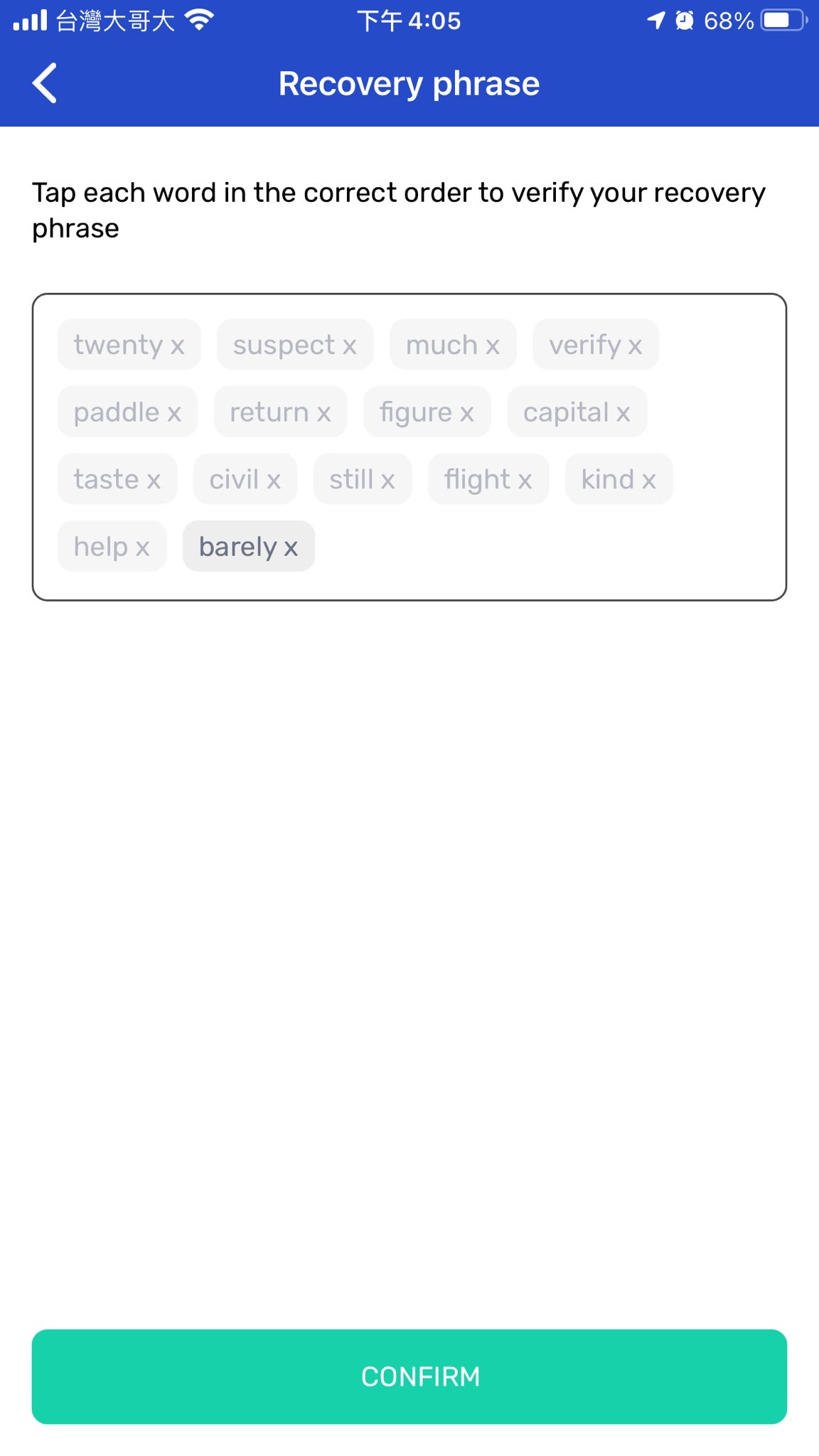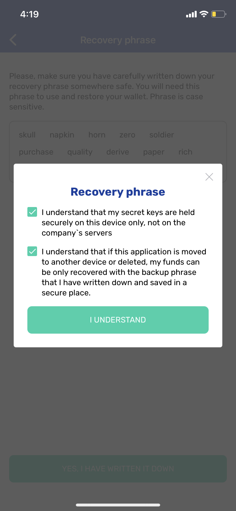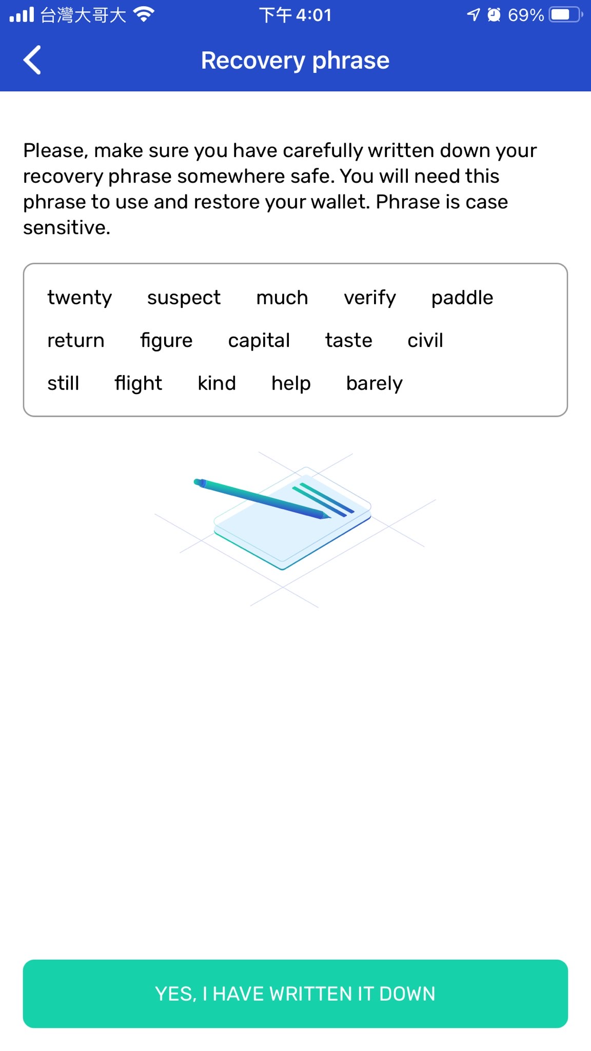 Please make sure you write down the 15 words of your wallet recovery phrase on a piece of paper in the exact oeder shown here.
