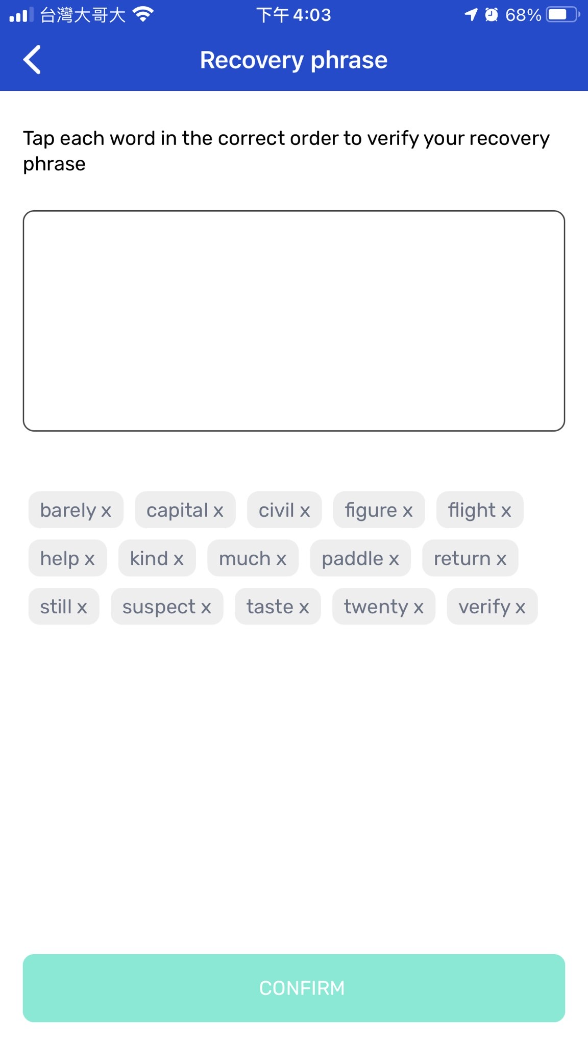 Please enter your 15-word wallet recovery pharse. Make sure you enter the words in the correct order.